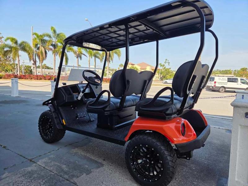 The 2025 E-Z-GO Liberty ELiTE Lithium in Solar Flare is a striking 4-passenger electric golf cart with long-range ELiTE lithium power, premium touring seating, and street-ready features professionally inspected and available in Charlotte, North Carolina with nationwide delivery and export from Golf Carts Hub.